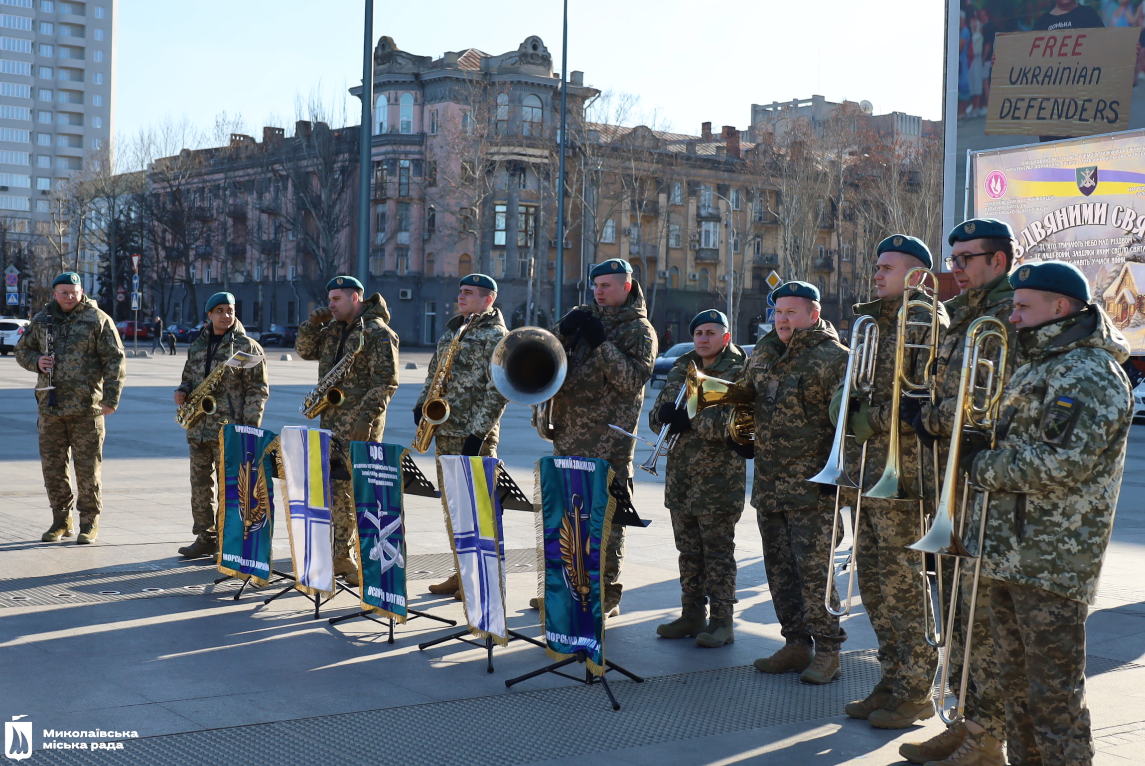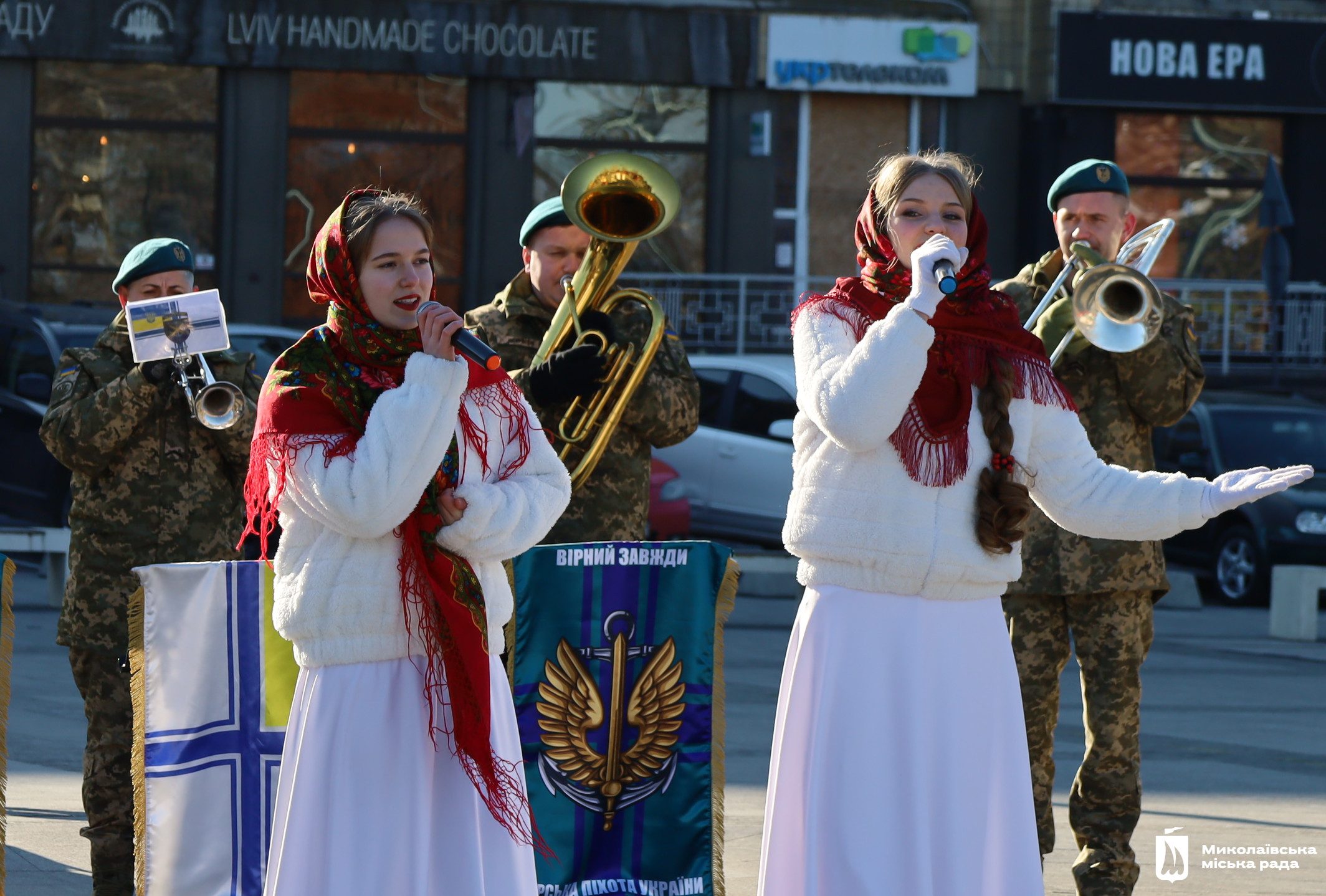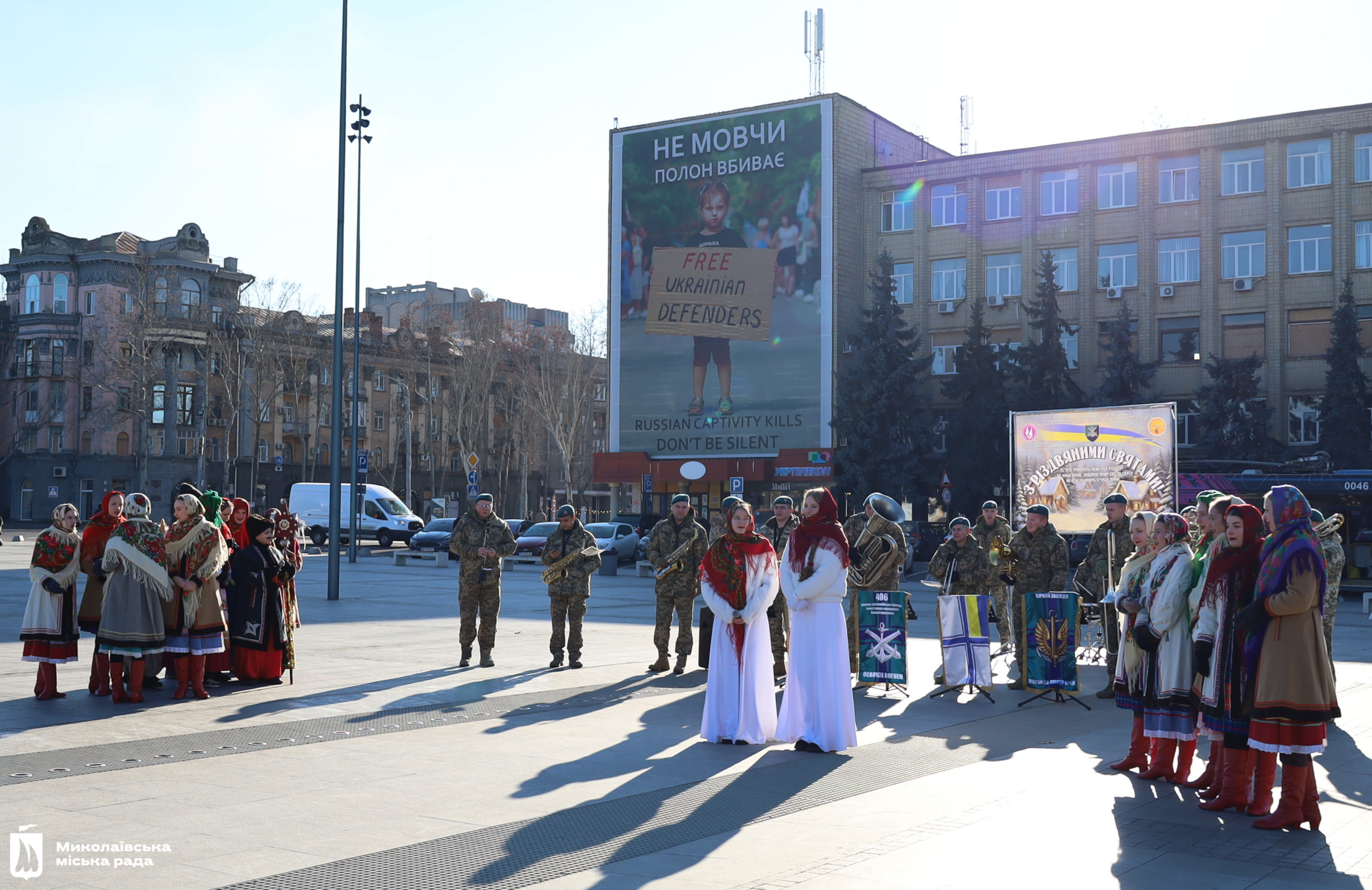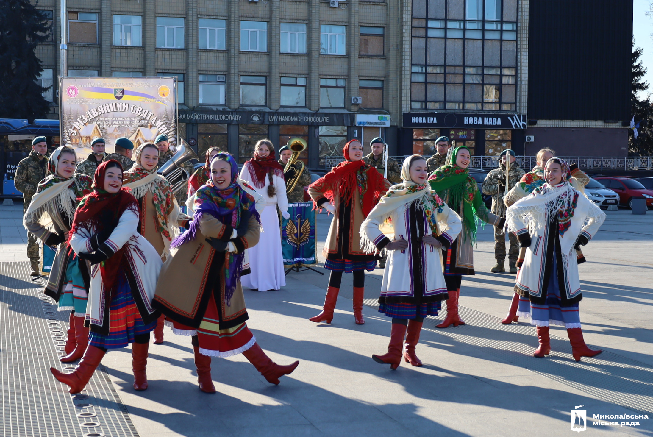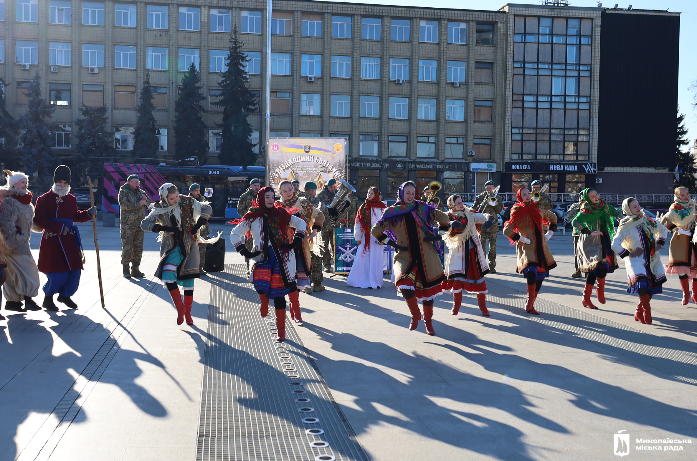 Військовий оркестр 406 окремої артилерійської бригади ім. генерала-хорунжого Олексія Алмазова Військово-морських сил ЗСУ і студенти Миколаївського фахового коледжу культури та мистецтва заспівали перед миколаївцями, що зібралися на площі, обрядові пісні. Маланка обмела віником присутніх, щоб достаток був у кожній хаті, колядники водили Козу, танцювали та бажали миру, добра і світла всій Україні.